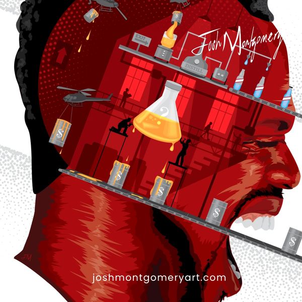 "Vulture" – This piece dives into the machinery of cultural commodification, exploring how identities are harvested for profit. Central to "Vulture" is a flask representing the 'secret sauce' of creativity within a factory backdrop. Each element reflects the loss of authenticity, urging respect for cultural origins.