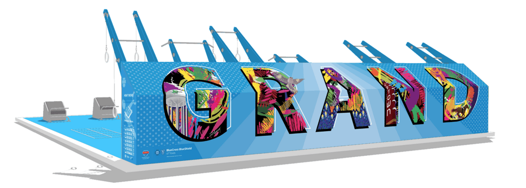 The "G" in "GRAND" celebrates Grand Prairie's iconic water tower, a beloved landmark that symbolizes local pride and identity. By embedding this staple within the letter itself, the mural reminds residents that this fitness space honors the place they call home.