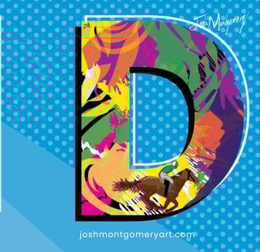 The "D" focuses on Lone Star Park, Grand Prairie's iconic horse racing venue, displaying a thoroughbred with a rider mounted. Established in 1997, Lone Star Park has become one of the most successful entertainment destinations in the Dallas-Fort Worth area, hosting over 700,000 guests annually.