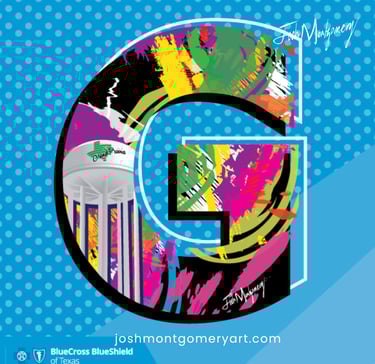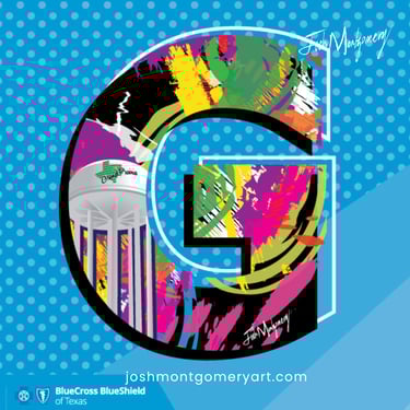 This mural celebrates the partnership between myself, the City of Grand Prairie, and the National Fitness Campaign to bring accessible wellness to our community. Each letter honors a defining landmark, from the iconic water tower and Uptown Theater to bluebonnets, the mockingbird, and Lone Star Park's thoroughbreds. "Go Grand!" is a love letter to the place I call home, inviting every resident to embrace health, pride, and community.