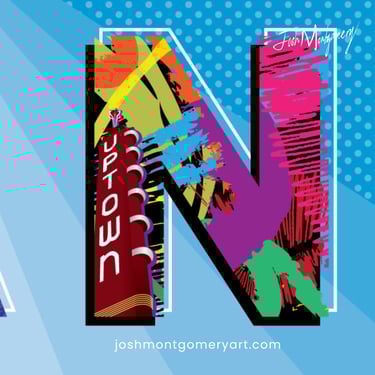The "N" focuses on the iconic Uptown Theater on Main Street in Grand Prairie, featuring the red tower with "Uptown" displayed prominently. This instantly recognizable landmark represents the heart of the community, a gathering place where culture and connection thrive.