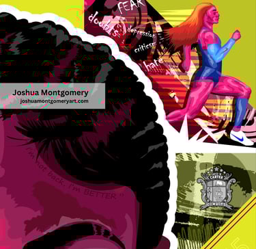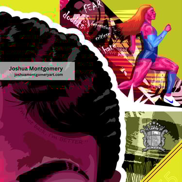 In this artwork, Sha'Carri blazes past words of negativity, leaving them behind as she sprints forward, symbolizing her resilience to rise above criticism.