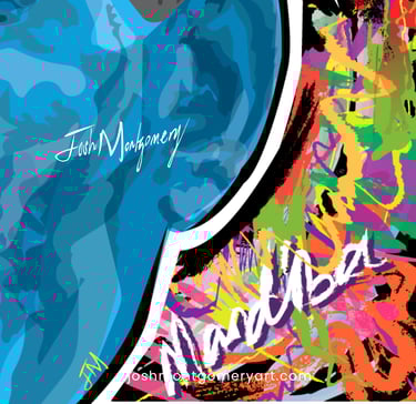 The artwork features a silhouette of Mahatma Gandhi, whose philosophy of nonviolent resistance profoundly influenced Mandela's early approach to activism and shaped his vision for peaceful protest. Also embedded in the piece is his African name, Madiba—the clan name by which he was affectionately known by family and loved ones. These elements honor both the global inspiration that guided his strategy and the deeply personal, cultural identity that grounded him throughout his journey, revealing a leader who drew strength from both universal ideals and ancestral roots.